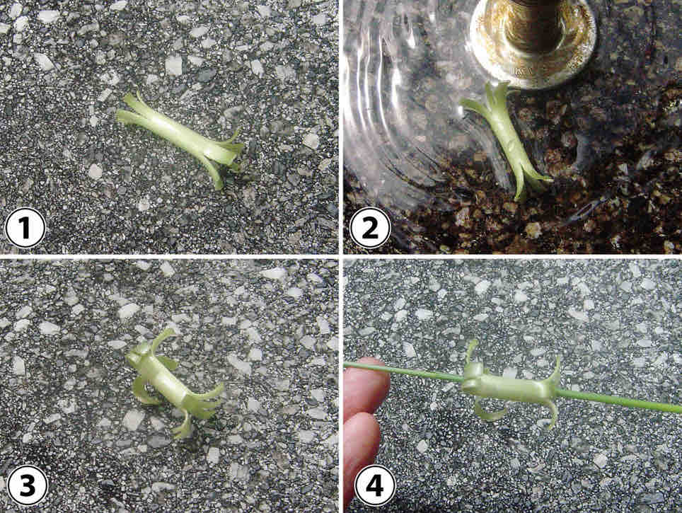 ①〜③タンポポの茎を折って、両サイドに切れ目を入れると鼓の形になります。②水をつけると早くそりかえります。④真ん中に棒を通して息を吹きかけるとくるくる回ります。また、上から水をかければ水車になります。タンポポから出る乳液で手がベタベタになりますからご注意を。